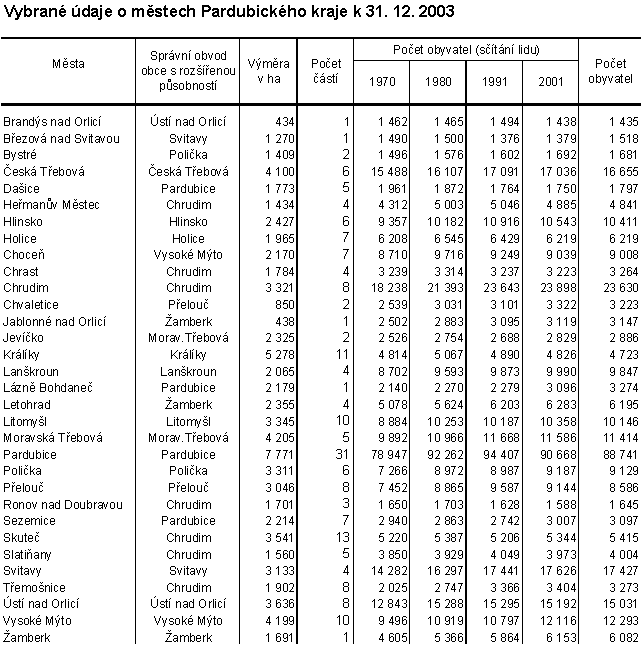 Vybrané údaje o městech Pardubického kraje k 31. 12. 2003