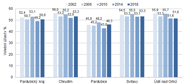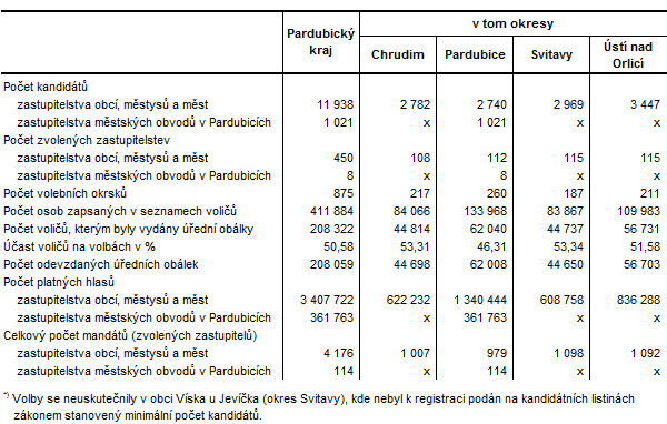 V Pardubickém kraji se letošních říjnových voleb do zastupitelstev obcí zúčastnilo 50,6 % voličů, což byl spolu se Středočeským krajem druhý nejvyšší podíl za Krajem Vysočina. Ve srovnání s volbami před čtyřmi lety byla účast voličů v kraji o 1,4 procentního bodu vyšší. Největší zájem měli voliči hlasovat v okrese Svitavy (53,3 %), mezi správními obvody obcí s rozšířenou působností v kraji na Hlinecku (58,8 %). Relativně nejméně voličů se dostavilo k volebním urnám v pardubickém okrese (46,3 %), zejména pak ve správním obvodu Pardubice (44,5 %).