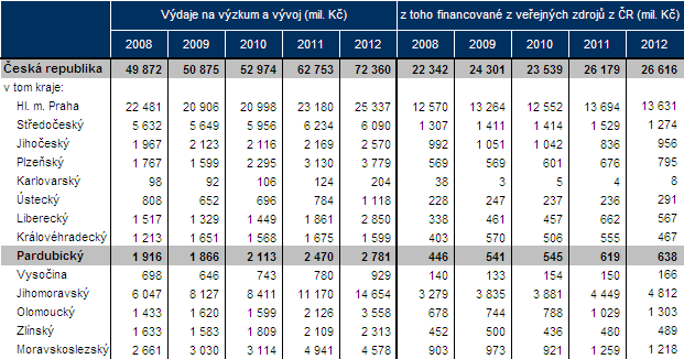 Z celkového objemu výdajů na výzkum a vývoj v ČR připadají dlouhodobě na Pardubický kraj 4 %, což do roku 2009 představovalo v mezikrajském srovnání 6. místo za Hlavním městem Prahou, Jihomoravským, Středočeským, Moravskoslezským a Jihočeským krajem, v roce 2011 se před Pardubický kraj zařadil namísto Jihočeského Plzeňský kraj. V roce 2012 se dopředu posunul ještě Olomoucký a Liberecký kraj. V menším rozsahu je v kraji realizován výzkum z veřejných zdrojů ČR. Částka 638 mil. Kč tvoří 2,4 % z celostátního objemu veřejných prostředků vynaložených na výzkum a vývoj v roce 2012. Méně bylo vydáno pouze v Karlovarském kraji, Kraji Vysočina, v Ústeckém, Královéhradeckém, Zlínském a Libereckém kraji. Zatímco celostátně tvoří tuzemské veřejné zdroje financování výzkumu téměř 37 %, v kraji je tento podíl 23 %. Naproti tomu má v kraji větší zastoupení výzkum financovaný podnikatelskou sférou (kraj 60 %, ČR 36 %). Postupně se zvyšuje podíl veřejných zahraničních zdrojů. V roce 2012 to bylo celostátně 16 %, zatímco v Pardubickém kraji 9 %.