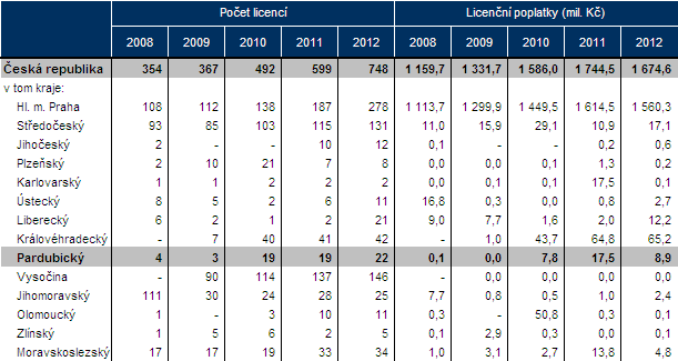 Podle údajů subjektů, které mají uzavřenou smlouvu na poskytnutí licence, bylo v ČR v roce 2012 celkem 122 poskytovatelů licencí na patenty a užitné vzory, z toho 8 z Pardubického kraje. Podíl poskytovatelů z kraje na celkovém počtu prodaných licencí byl 2,9 %, na přijatých licenčních poplatcích však pouze 0,5 %. Licenční poplatky za 22 licencí od poskytovatelů z Pardubického kraje činily 8,9 mil. Kč, přitom na dvě nové licence z této částky připadalo 0,2 mil. Kč. Největší počet aktivních licencí byl evidován v roce 2012 v Hlavním městě Praze, kam směřovalo 93 % všech licenčních poplatků. Jediným krajem bez nových aktivních licencí byl v posledních dvou letech Karlovarský kraj, v roce 2012 se k němu přidal ještě Královéhradecký kraj.