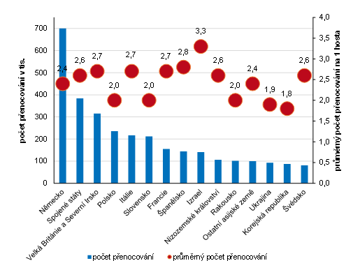 Z jednotlivých zemí převládali mezi nerezidenty ve druhém čtvrtletí 2025 již ustáleně hosté z Německa (16,2 % z celkového množství zahraničních hostů). Vysoké počty turistů přicestovaly i ze Spojených států (8,3 %), Velké Británie a Severního Irska (6,6 %), Polska (6,5 %) nebo Slovenska (6 %). Z asijské oblasti si Prahu za cíl své návštěvy zvolili nejčastěji Korejci (48,7 tis.; 2,7 %). Absolutně přibylo meziročně především Slováků (15 tis.), občanů Velké Británie a Severního Irska (12,3 tis.) a Spojených států (7,7 tis.). Na ústupu byla naopak návštěvnost ze Švýcarska (-6,5 tis. hostů) nebo Finska (-3,3 tis.), která byla o rok dříve podpořena významnými sportovními akcemi.