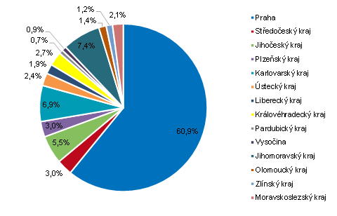 Z celkového množství zahraničních hostů, kteří se ve druhém kvartále 2025 vypravili do Česka, a alespoň jednou přenocovali v některém z hromadných ubytovacích zařízení, jich do hlavního města zamířilo 60,9 %. Další oblasti s významnější návštěvností následovaly s obvyklým značným odstupem: Jihomoravský kraj (7,4 %), Karlovarský kraj (6,9 %) a Jihočeský kraj (5,5 %). Zájem českých rezidentů o jednotlivé kraje byl také již tradičně vyrovnanější. Kromě Jihomoravského kraje (12,1 %) a Prahy (11,9 %), projevovali rezidenti zvýšený zájem i o kraje Jihočeský (9,9 %), Královéhradecký (9,1 %) a Středočeský (8,7 %).