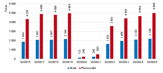 Rovněž počet přenocování v Praze lámal rekordy jak z pohledu porovnání druhých čtvrtletí, tak i ve srovnání prvních šesti měsíců roku za posledních 14 let. Ve druhém čtvrtletí 2025 přenocovalo v Praze 4 984 489 hostů. Na zahraniční turisty připadá 86,7 % (4,3 mil.) přenocování, na domácí hosty 663,2 tis. noclehů. Celkový počet přenocování za druhý kvartál 2025 meziročně vzrostl o 7 % (326,1 tis. noclehů). Přírůstek množství přenocování na straně nerezidentů dosáhl na 7,7 % (310 tisíc), u rezidentů na 2,5 % (16,1 tis.). Více než třicetitisícové přírůstky počtu přenocování byly vykázány u hostů z Velké Británie a Severního Irska, Slovenska a Německa. Samotní Němci se zasloužili o 700,6 tis. přenocování v pražských hromadných ubytovacích zařízeních. Další významné počty připadají na občany Spojených států (384,2 tis. přenocování) a Velké Británie a Severního Irska (315 tis.).