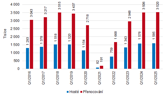 V prvním čtvrtletí roku 2025 se ubytovalo v hromadných ubytovacích zařízeních v Praze téměř 1,6 mil. hostů, kteří zde realizovali 3,5 mil. přenocování. Z celkového množství hostů tvořili 76,7 % zahraniční turisté. Meziroční nárůsty počtu hostů (+0,5 %) i množství jejich přenocování (+0,4 %) byly pouze mírné, přesto dosáhnul celkový počet hostů i jejich přenocování na nejvyšší hodnoty v porovnání prvních čtvrtletí od roku 2012.