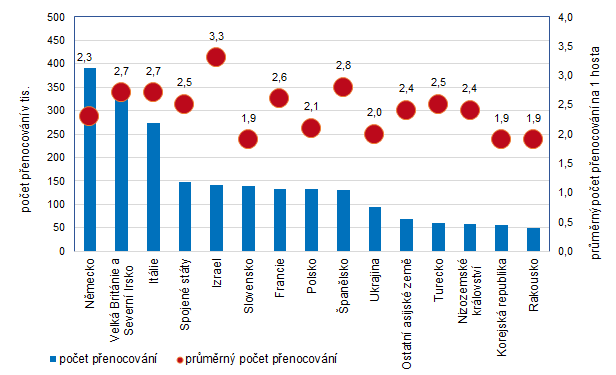Na straně zahraničních hostů se počet přenocování meziročně mírně zvýšil (+1,2 %; 33 585 přenocování), množství přenocování rezidentů naopak o 3,3 % (20 178 noclehů) pokleslo. Výrazné navýšení počtu přenocování se týkalo zejména turistů z Izraele (+59,1 tis. nocí), Velké Británie a Severního Irska (+51,8 tis.) a Polska (+31,1 tis.). Němci v Praze realizovali meziročně o 87,9 tis. přenocování méně, počet přenocování Slováků poklesl o 30,6 tis. a u Maďarů o 12,1 tis.