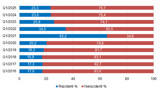 Graf 3: Podíl rezidentů a nerezidentů na celkovém počtu hostů v 1. čtvrtletí 2016 až 2025