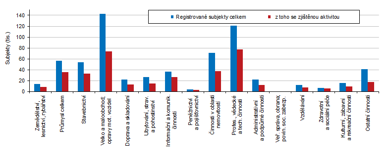 Nejvíce registrovaných subjektů, které jsou zároveň aktivní (posuzovány podniky z odvětví činnosti zahrnující alespoň 1 000 subjektů), jich patřilo do odvětví činnosti související se zaměstnáním (84 %), zdravotní péče (82,8 %), výroba a rozvod elektřiny, plynu, tepla a klimatizovaného vzduchu (80,6 %) a finanční zprostředkování kromě pojišťovnictví a penzijního financování (78,3 %). Naopak menší aktivita byla zjištěna v oborech: činnosti organizací sdružujících osoby za účelem prosazování společných zájmů (jen 20,8 % vykazovalo aktivitu), maloobchod, kromě motorových vozidel (48,2 % vykazovalo aktivitu), činnosti související se stavbami a úpravou krajiny (51,6 %), administrativní, kancelářské a jiné podpůrné činnosti pro podnikání (52 %) a velkoobchod kromě motorových vozidel (52,7 %).