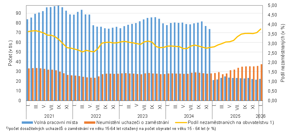 Kromě nezaměstnanosti se, byť velmi mírně, zvyšoval také počet volných pracovních míst. Dle Úřadu práce se v lednu 2026 zvýšil meziměsíčně počet volných míst o 744 (tedy o 3,4 %), na celkový počet 22 442. Meziročně byl počet volných míst vyšší o 1 217 míst (tedy o 5,7 %).