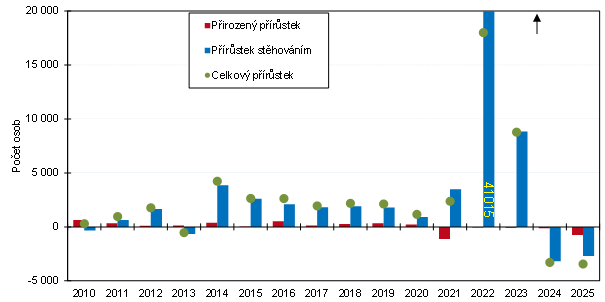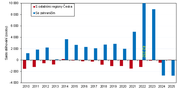 Na populačním úbytku Prahy v 1. čtvrtletí 2025 se výraznou měrou podílela migrace, kvůli níž ubylo v Praze 2 702 obyvatel. Tento úbytek zajistilo výhradně stěhování do zahraničí, kam se odstěhovalo o 2 748 více osob, než se ze zahraničí přistěhovalo. Stěhováním s ostatními regiony Česka naopak Praha získala o 46 osob více. V 1. čtvrtletí 2025 se do Prahy přistěhovalo celkem 15 504 osob, což bylo o 6,4 % méně než ve stejném období loňského roku. Vystěhovalých osob z Prahy bylo 18 206, což představovalo meziroční pokles o 7,8 %. Nutno však opět připomenout, že velkou část vystěhovalých představovaly osoby (především z Ukrajiny), kterým na konci března skončila platnost dočasné ochrany, a nepožádaly si o její prodloužení.