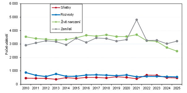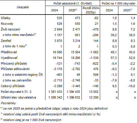 Během 1. čtvrtletí 2025 zemřelo celkem 3 214 osob a na svět přišlo 2 471 dětí. Počet zemřelých se meziročně zvýšil o 4,7 %, naopak počet živě narozených poklesl o 16,2 %. Meziroční pokles porodnosti, který započal v prvním čtvrtletí roku 2022, tak pokračuje i v následujících třech letech. Počet zemřelých byl vyšší než počet narozených a tak přirozenou měnou v 1. čtvrtletí 2024 klesl počet obyvatel o 743 osob. Tento přirozený úbytek byl větší než v 1. čtvrtletí předchozího roku, kdy přirozenou měnou ubylo 121 osob.