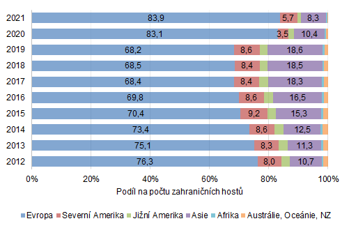 Od roku 2012 došlo k postupným výrazným změnám ve skladbě návštěvníků Prahy. Stěžejní místo v evidenci počtu hostů hromadných ubytovacích zařízení v letech 2012-2019 pořád zaujímaly s velkým náskokem evropské země, ale stále více se prosazovaly i asijské státy. Podíl evropských zemí na celkové návštěvnosti ze zahraničí postupně poklesl ze 76,3 % v roce 2012 na 68,2 % v roce 2019, a to i přesto, že Evropanů mezi návštěvníky Prahy po celé období přibývalo. Jelikož však hostů z Asie přibývalo výraznějším tempem, narostl i jejich podíl na celkové návštěvnosti ze zahraničí z 10,7 % v roce 2012 na 18,6 % v roce 2019. Mezi 8 a 9 % kolísal po celé období podíl Severní Ameriky.