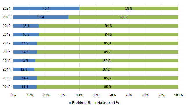 Obrázek 2: Podíl rezidentů a nerezidentů na celkovém počtu hostů v hl. m. Praze v letech 2012-2021