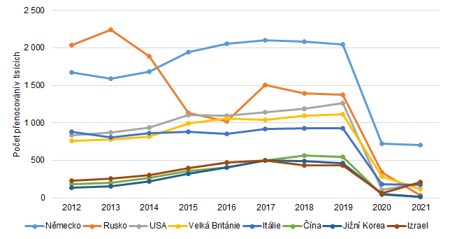 Obrázek 5: Počet přenocování z významných zdrojových zemí v letech 2012-2021