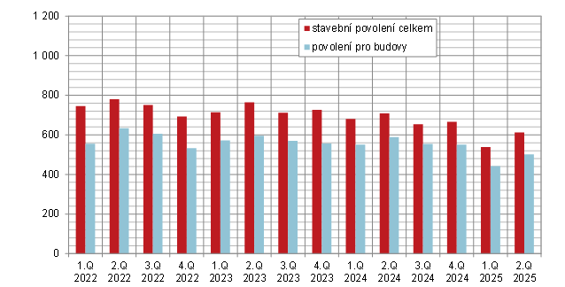 Během druhého čtvrtletí 2025 bylo podle předběžných údajů v Praze vydáno celkem 612 stavebních povolení a ohlášení. Oproti stejnému období roku 2024 jejich počet poklesl o 13,7 %. K meziročním propadům došlo ve všech krajích České republiky. Největší poklesy byly zaznamenány v Karlovarském (o 28,6 %), Jihomoravském (o 25,5 %) a Středočeském kraji (o 25,5 %). Na celorepublikové úrovni se jejich počet meziročně snížil o 21,4 %.