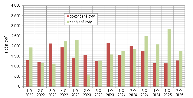 Počet dokončených bytů za druhé čtvrtletí 2025 činil podle předběžných údajů 1 289 bytů, což představovalo značný meziroční pokles o 36,1 % (ve stejném období uplynulého roku 2024 bylo dokončeno 2 018 bytů).