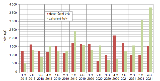 Počet dokončených bytů v roce 2021 činil podle předběžných údajů 5 229 bytů, což představovalo meziroční mírný pokles o 4 % (během roku 2020 bylo dokončeno 5 449 bytů). Na republikové úrovni došlo k meziročnímu nepatrnému nárůstu o 0,7 %. Z hlediska krajů byl nejvyšší meziroční nárůst počtu dokončených bytů zaznamenán v kraji Vysočina (20,2 %), v Královehradeckém (15,9 %) a v Ústeckém kraji (12,9 %). Naopak k největším meziročním poklesům došlo v Olomouckém (-13,2 %) a Středočeském kraji (-6,6 %). V počtu dokončených bytů byla Praha na druhém místě, hned po Středočeském (6 385 dokončených bytů). Těsně za Prahou se pak umístil Jihomoravský kraj (4 791 dokončených bytů). Toto pořadí krajů podle počtu dokončených bytů je stálé od roku 2018. Nejméně bytů bylo dokončeno v Karlovarském kraji (611 bytů) a Libereckém kraji (885 bytů).