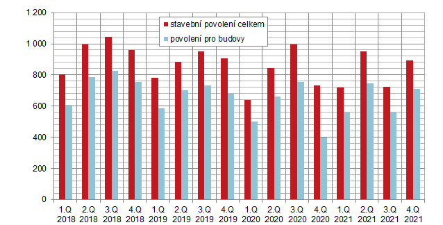 V průběhu roku 2021 bylo podle předběžných údajů v Praze vydáno celkem 3 284 stavebních povolení a ohlášení. Oproti roku 2020 jejich počet vzrostl o 2,3 %. Ve všech krajích ČR došlo k nárůstu stavebních povolení a ohlášení, přičemž nejvíce jich bylo v sousedním Středočeském kraji (17 857), kde se staví z valné většiny rodinné domy. Na celorepublikové úrovni se jejich počet meziročně zvýšil o 5,8 %.