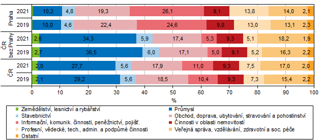 Hrubá přidaná hodnota (HPH) v běžných cenách za rok 2021 v Praze dosáhla hodnoty 1 524 027 mil. Kč, což je o 7,6 % více než v předchozím roce a o 59,2 % více než v roce 2011. K jedinému meziročnímu poklesu v celém období 2011-2021 došlo mezi lety 2019 a 2020, konkrétně o 0,8 %. Až na tuto výjimku HPH v Praze celou dobu plynule stoupalo. Opět je zde třeba připomenout, že jde o údaje v běžných cenách a odpovídajících tudíž cenám v daném roce. Hodnoty nejsou o cenový růst očištěny. Nejvíce HPH za rok 2021 připadalo na obchod, dopravu, ubytování a pohostinství (294 183 mil. Kč), což tvořilo 19,3 % celkového HPH v tomto roce. Praha jako hlavní město je přirozeným centrem obchodu a také patří mezi přední evropské turistické destinace. Další odvětví s vysokým podílem na HPH jsou informační a komunikační činnosti (16,1 %), kde podíl v Praze výrazně převyšoval podíl v jiných krajích ČR, následně veřejná správa, obrana, vzdělávání, zdravotní a sociální péče (14 %) nebo profesní, vědecké, technické a administrativní činnosti (13,8 % – i zde pražský podíl převyšoval podíly ostatních krajů). Naopak nejmenší podíl připadl na zemědělství, lesnictví a rybářství – za rok 2021 to bylo pouze 0,4 %. Je to dáno specifickým městským charakterem kraje, kde je jako ve většině velkoměst ekonomická základna zaměřena na odvětví služeb. Největší podíl zemědělství, lesnictví a rybářství zaznamenal kraj Vysočina (5,5 %). Oproti ostatním krajům České republiky pak Praha nejvýrazněji ztrácí u průmyslu, těžby a dobývání, kde podíl na HPH činí pouze 10,2 % (z toho 6,3 % zpracovatelský), zatímco u ostatních krajů se tento podíl pohyboval mezi 25,2 % (Jihomoravský kraj) až 41,2 % (Zlínský kraj). V meziročním srovnání let 2021 a 2020 v Praze došlo k největšímu nárůstu hrubé přidané hodnoty u zemědělství, lesnictví a rybářství (o 20,3 %). Přesto ovšem toto odvětví má v Praze pouze zanedbatelný význam. U nejvýznamnějšího obchodu, dopravy, ubytování a pohostinství došlo k meziročnímu procentuálnímu nárůstu o 11,2 % a u informačních a komunikačních činnostech o 6,6 %. K poklesu však došlo v případě zpracovatelského průmyslu (o 3,3 %) a činnosti v oblasti nemovitostí (o 0,3 %). U všech ostatních odvětví došlo alespoň k mírnému nárůstu (o 0,6-13,4 %). Celková HPH v běžných cenách v Praze nicméně dlouhodobě vykazuje největší hodnoty ze všech krajů ČR. Sousední Středočeský kraj pak dosahuje druhých nejvyšších hodnot (625 864 mil. Kč v roce 2021) a třetí je Jihomoravský kraj (609 957 mil. Kč v roce 2021). Naopak nejmenší HPH byla v letech 2011-2021 naměřena v Karlovarském (90 707 mil. Kč v roce 2021) a v Libereckém kraji (169 867 mil. Kč v roce 2021). Třetí nejmenší hodnoty byly v kraji Vysočina (213 275 mil. Kč v roce 2021). V celé České republice hrubá přidaná hodnota v běžných cenách za rok 2021 dosáhla hodnoty 5 550 848 mil. Kč. Praha tak představovala 27,5 % této hodnoty.
