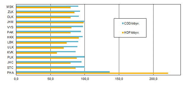 Porovnání HDP a ČDDD na obyvatele mezi kraji (v Kč, průměr ČR = 100 %)