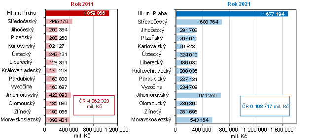 Hrubý domácí produkt na 1 obyvatele za rok 2021 v Praze byl 1 264 456 Kč. Ve srovnání s předchozím rokem to bylo o 7,8 % více a vůči předcovidovému roku 2019 o 5,2 % více. Rok 2020 byl ve sledovaném období let 2011-2021 jediným rokem, kdy došlo k meziročnímu poklesu HDP na 1 obyvatele v Praze. Tento propad (o 2,4 % vůči roku 2019) byl způsoben celosvětovou pandemií Covidu-19, respektive zavedením plošných protipandemických opatření. Praha si také v tomto období udržuje zdaleka nejvyšší HDP na 1 obyvatele ze všech krajů ČR. Druhý nejvyšší hrubý domácí produkt na 1 obyvatele v roce 2021 byl dosažen v Jihomoravském kraji (562 278 Kč), následovaný krajem Královéhradeckým (522 295 Kč). Praha je převyšuje 2,2 krát, respektive 2,4 krát v případě Královehradeckého kraje. Naopak nejmenší hodnoty v tomto roce byly zaznamenány ve všech třech severočeských krajích – Karlovarském (339 491 Kč), Ústeckém (395 524 Kč) a Libereckém kraji (421 913 Kč). V České republice pak HDP na 1 obyvatele za rok 2021 činil 571 051 Kč. Praha tak celorepublikový průměr překročila 2,2 krát.