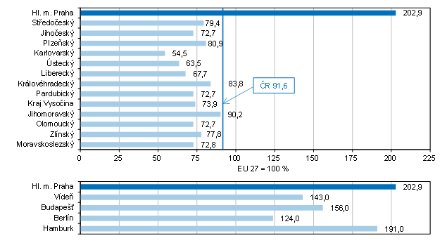 Ve srovnání s vybranými středoevropskými metropolemi (ke srovnání byl vybrán Berlín, Hamburk, Vídeň a Budapešť, vzhledem k tomu, že územně odpovídají městům podle členění NUTS 2, stejně jako Praha a jsou tak vzájemně srovnatelné) se Praha se svými 202,9 % umístila v roce 2021 nejvýše. Toto prvenství Praha vykazuje od roku 2018, kdy v tomto roce procentuálně předčila Hamburk. Procentuální hodnota ve vztahu k průměru EU u HDP na 1 obyvatele v PPS města Hamburk pak v roce 2021 činila 191 %[1], přičemž se tato severoněmecká metropole umístila v rámci srovnání všech regionů EU podle členění NUTS 2 hned za Prahou. Následuje maďarské hlavní město Budapešť, kde to bylo 156 %. V případě rakouské Vídně to pak bylo 143 %, zatímco Berlín vykázal hodnotu 124 %1. Největší procentuální rozdíl byl tedy mezi Prahou a Berlínem, konkrétně 78,9 p. b. Zároveň Praha a Budapešť zaznamenala během let 2011-2021 nárůst o 17 p. b. (v případě Prahy), respektive o 11 p. b. (v případě Budapešti). Naopak k poklesu došlo v tomto období v případě Vídně (o 22 p. b.) a Hamburku (o 13 p. b.), zatímco Berlín vykázal v zásadě neměnné hodnoty (mírný nárůst o 3 p. b.).