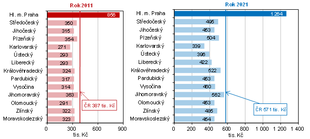 Čistý disponibilní důchod domácností (ČDDD) na 1 obyvatele za rok 2021 v Praze činil 402 406 Kč. To je o 13,4 % více než v předchozím roce 2020, kdy dosáhl hodnoty 354 855 Kč. Šlo tak o druhý největší (po roce 2017) meziroční procentuální nárůst čistého disponibilního důchodu domácností na 1 obyvatele v Praze od roku 2011. S výjimkou roku 2012, kdy došlo v důsledku dopadů globální ekonomické krize k poklesu, se ČDDD na 1 obyvatele v Praze od roku 2011 neustále zvyšoval. U mezikrajského srovnání má Praha v celém sledovaném období 2011-2021 ze všech krajů ČR nejvyšší čistý disponibilní důchod domácností na 1 obyvatele. Druhý nejvyšší ČDDD na 1 obyvatele byl v celém období 2011-2021 zaznamenán v sousedním Středočeském kraji, kde byla v posledním sledovaném roce 2021 naměřena hodnota 295 852 Kč. Tento kraj především těží z propojenosti s hlavním městem Prahou. V roce 2021 více než 290 000 Kč čistého disponibilního důchodu na osobu dosáhly ještě kraje Plzeňský (293 568 Kč) a Jihomoravský (292 153 Kč). Naopak kraj s nejnižším čistým disponibilním důchodem domácností na 1 obyvatele představoval v roce 2021 Karlovarský kraj. Zde byl ČDDD na 1 obyvatele pouze 255 189 Kč, což je o 36,6 % méně než v Praze. V celé České republice pak ČDDD na 1 obyvatele v roce 2021 činil 295 159 Kč, což je v porovnání s Prahou o 26,7 % méně.