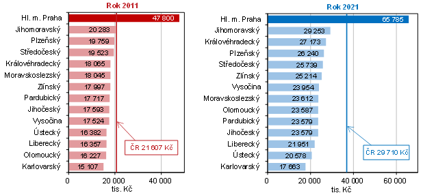 Zatímco v ukazateli HDP na osobu v Kč dosáhla Praha 2,2 krát vyšší hodnotu než je průměr ČR, podle ukazatele disponibilního důchodu měla „jen“ 1,4 krát více. U Jihomoravského kraje, který v roce 2021 vytvořil druhý nejvyšší domácí produkt na osobu a jeho HDP na osobu bylo o 1,5 p. b. menší než byl průměr ČR, byl čistý disponibilní důchod domácností mírně pod průměrem ČR (o 1,0 p. b.). A kraj Královéhradecký (třetí nejvyšší hodnota HDP na osobu v Kč v ČR) měl HDP na osobu o 8,5 p. b. nižší než byl průměr ČR a zároveň měl tento kraj ČDDD o 3,1 p. b. nižší než průměr ČR. Naopak jediný Středočeský kraj (pátá nejvyšší HDP na osobu mezi kraji), přesáhl průměr čistého disponibilního důchodu ČR (o 0,2 p. b.), ale na jeho území se vytvořilo méně HDP na osobu než v ČR celkem (o 13,4 p. b.).