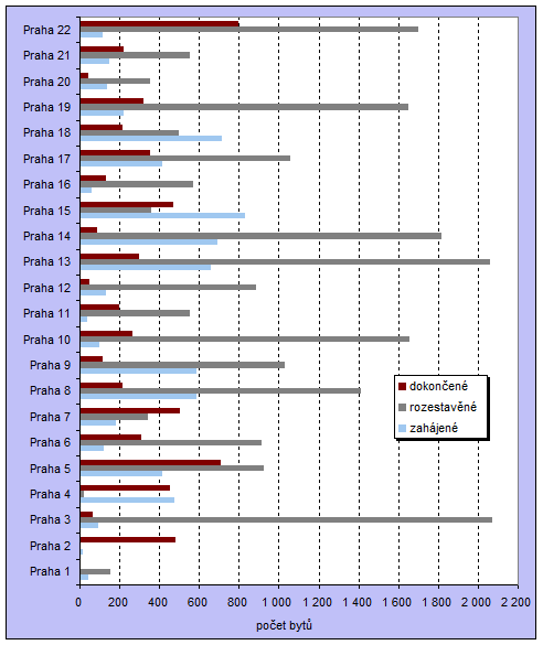 V meziročním srovnání došlo v průběhu roku 2008 v celorepublikovém průměru k mírnému zvýšení počtu rozestavěných bytů (+3 %). V hl. m. Praze bylo ke konci roku 2008 rozestavěno celkem 19 412 bytů, což bylo o 2,5 % více než ve stejném období roku 2007. Nejvyšší nárůst počtu rozestavěných bytů byl v bytových domech, a to o 11%, naopak snížení rozestavěnosti bylo zaznamenáno u bytů v rodinných domech (-12,6 %).