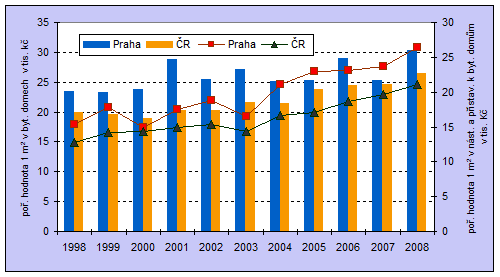 Porovnáme-li pořizovací hodnotu 1 m2 užitkové plochy nově dokončených bytů v roce 2008 z krajského hlediska, tak je patrné, že tato hodnota je u bytů dokončených v hl. m. Praze vyšší než je v ostatních krajích a než je průměr v celé republice, a to jak u bytů v rodinných domech, tak i u bytů v obou formách nástaveb, přístavech a vestaveb. Výjimkou jsou bytové domy, kde průměrná pořizovací hodnota 1 m2 je nejvyšší ve Středočeském kraji (31 974 Kč), což je o 1 662 Kč více než v hlavním městě (30 312 Kč) a dokonce o 5 456 Kč více než je celorepublikový průměr (25 301 Kč). U bytových domů v hl. m. Praze se pořizovací cena 1 m2 meziročně zvýšila o téměř 20 % (v ČR nárůst 7,5 %), u rodinných o 27 % (v ČR nárůst 8 %).