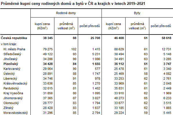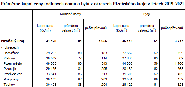 Krajská hodnota průměrné kupní ceny bytů v roce 2021 převýšila průměr kupní ceny za rodinné domy o 3 586 Kč za 1 m2. Přesto jednotková průměrná kupní cena bytu nepřekonala průměrnou kupní cenu za rodinný dům v pěti okresech ze sedmi. Pouze v okresech Plzeň-jih a Rokycany byla v průměru kupní cena za byt vyšší než za rodinný dům.