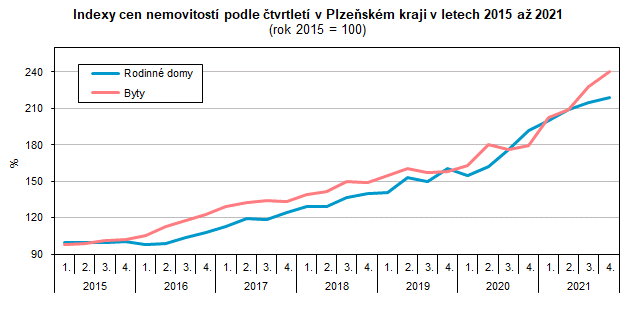 Vývoj cen rodinných domů téměř kopíruje trend vývoje cen bytů. Pouze na počátku sledovaného období na rozdíl od bytů dochází u rodinných domů k mírnějšímu poklesu ceny, a to ve 2. a 3. čtvrtletí 2015, následně i v 1. čtvrtletí 2016. Od tohoto období zaznamenávají ceny rodinných domů plynulý růst s drobnými výkyvy ve 3. čtvrtletí let 2017 a 2019 a následně hned v 1. čtvrtletí roku 2020. Index cen rodinných domů dosáhl ve 4. čtvrtletí roku 2021 hodnoty 219,0 %.