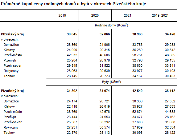 V Plzeňském kraji v období let 2019 až 2021 jednotková kupní cena bytů v průměru převyšovala cenu rodinných domů. Nejvíce došlo k navýšení průměrné kupní ceny bytů v roce 2021 v okrese Klatovy, kde kupní cena bytu vzrostla od roku 2019 o 60,3 %. Okresy Plzeň-jih a Plzeň-sever vykazovaly téměř 50% přírůstek průměrné kupní ceny bytů. V ostatních okresech kraje byl nárůst kupní ceny mezi 25,5–39,4 %. Na Domažlicku vzrostly průměrné kupní ceny bytů nejméně, a to o 25,5 %.