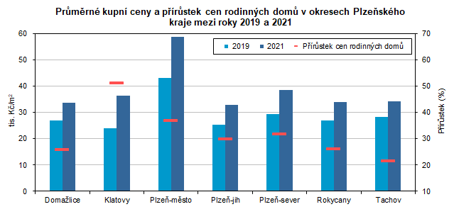 Průměrné kupní ceny rodinných domů za 1 m2 jsou v Plzeňském kraji nižší než ceny bytů. Výše kupních cen rodinných domů a bytů závisí na konkrétní sídelní struktuře a v jednotlivých okresech je situace odlišná. Průměrná kupní cena rodinného domu v roce 2021 vykazovala 26,3% nárůst od roku 2019. Pokud porovnáme vývoj kupní ceny mezi okresy, nejvíc vzrostly ceny za rodinný dům v okrese Klatovy, a to o 51,1 %. V ostatních okresech kraje byl nárůst kupní ceny rodinného domu v rozmezí od 21,4 % do 36,7 %.