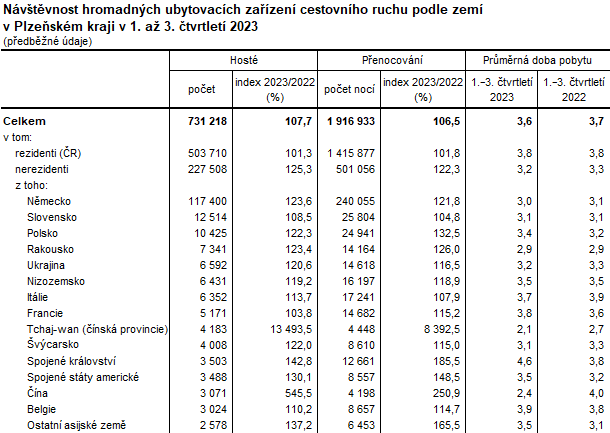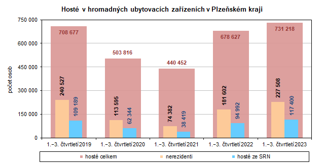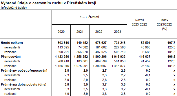 Z předběžných údajů vyplývá, že ve 3. čtvrtletí 2023 do hromadných ubytovacích zařízení Plzeňského kraje přijelo 351 273 osob, z toho 27,0 % byli hosté ze zahraničí (nerezidenti) a zbývajících 73,0 % tvořili tuzemští návštěvníci (rezidenti). Ve srovnání se stejným obdobím minulého roku se celková návštěvnost kraje mírně zvýšila (o 2,9 %) především díky nárůstu počtu zahraničních návštěvníků (o 17,0 %). U domácích hostů byl meziročně zaznamenán pokles návštěvnosti, a to o 1,5 %. Nejpočetnější skupinu zahraničních turistů ve 3. čtvrtletí 2023 představovali návštěvníci z Německa. Plzeňský kraj jich navštívilo v tomto období 46 904, což byla téměř polovina všech zahraničních hostů (49,4 %). Mezi další početnější skupiny zahraničních turistů patřili hosté ze Slovenska (5 212, tj. 5,5 %), Polska (4 737, tj. 5,0 %), Nizozemska (3 685, tj. 3,9 %) a Rakouska (3 204, tj. 3,4 %).