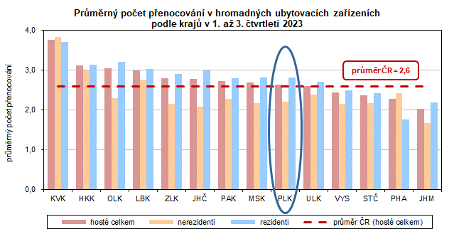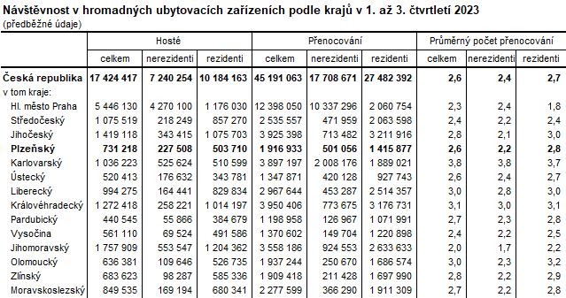 Návštěvníci strávili v 1. až 3. čtvrtletí roku 2023 v hromadných ubytovacích zařízeních Plzeňského kraje celkem 1 916 933 nocí a ve srovnání se stejným obdobím předchozího roku se tento ukazatel zvýšil o 6,5 %. Při přepočtu na jednoho hosta vychází průměrný počet přenocování na 2,6 noci a průměrná doba pobytu na 3,6 dne. Při porovnání se stejným obdobím roku 2022 se průměrný počet přenocování mírně snížil. S průměrnou dobou pobytu 3,6 dní se zařadil Plzeňský kraj ve srovnání s ostatními regiony na deváté místo v ČR a je srovnatelný s průměrem ČR. Nejdelší průměrná doba pobytu byla zaznamenána v případě hostů Karlovarského kraje, a to 4,8 dní, naopak nejkratší v Jihomoravském kraji (3,0 dní).