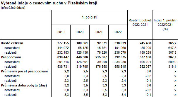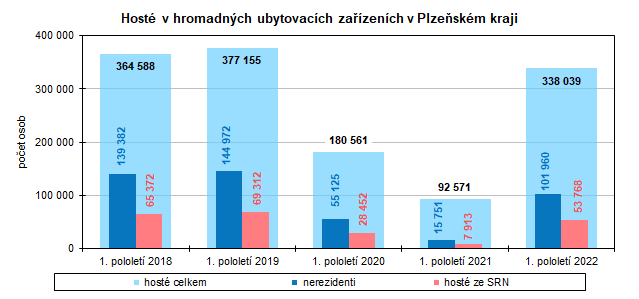 Celkový počet hostů v Plzeňském kraji meziročně vzrostl o 265,2 %, u nerezidentů dokonce o 547,3 %, a počet přenocování vzrostl o 267,7 % (u cizinců o 499,9 %). Hostů z Německa přijelo na území kraje v období mezi lednem a červnem roku 2022 téměř sedminásobně více než ve stejném období roku 2021.