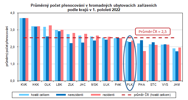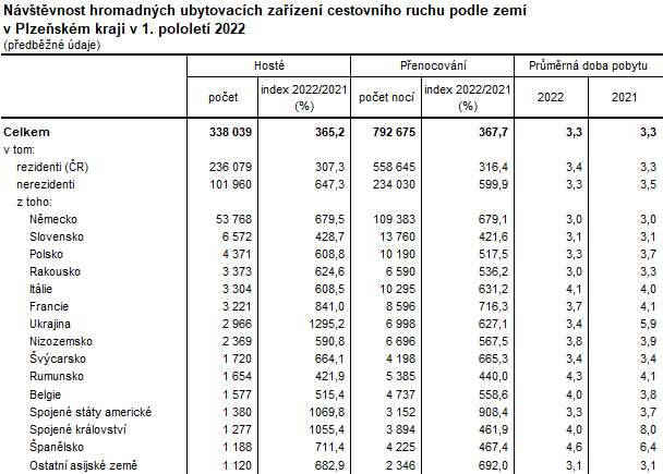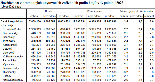 Návštěvníci Plzeňského kraje strávili celkem v období ledna až června v Plzeňském kraji 792 675 nocí, což představuje ve srovnání se stejným obdobím roku 2021 nárůst o 577 tis. nocí. Při přepočtu na jednoho hosta tak vychází průměrný počet přenocování na 2,3 noci a průměrná doba pobytu na 3,3 dne, což je srovnatelná hodnota v porovnání s 1. pololetím roku 2021. K mírnému prodloužení pobytu došlo jen u domácí klientely v meziročním porovnání, a to o 0,1 dne.