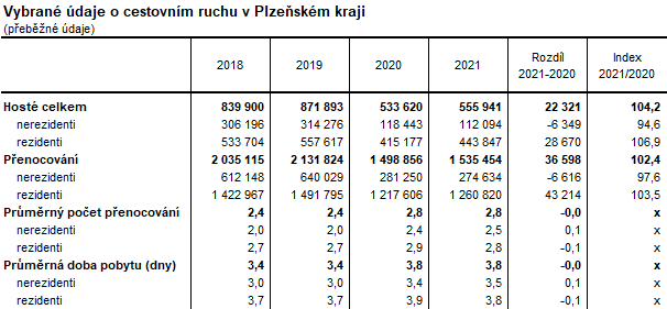 Hosté v hromadných ubytovacích zařízeních ve 4. čtvrtletí 2021 strávili v regionu celkem 277 496 nocí, jednalo se o celkový nárůst, který představoval 3,7 násobek vyšší počet přenocování ve srovnání se stejným obdobím předchozího roku. V porovnání mezi regiony tak zaznamenal Plzeňský kraj třetí nejvyšší nárůst v počtu přenocování hostů. V průměru připadaly na jednoho hosta 2,4 noci, průměrná doba pobytu dosahovala 3,4 dne.