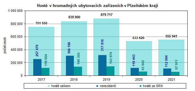 Plzeňský kraj navštívilo v roce 2021 celkem 555 941 hostů, což ve srovnání se stejným obdobím roku 2020 představuje mírný nárůst o 4,2 %. Přestože v průběhu roku 2021 nebyly podmínky k cestování stále příznivé vzhledem k přetrvávající epidemické situaci, byl zaznamenán mírný meziroční nárůst návštěvnosti. Pouze v případě zahraničních návštěvníků byl zaznamenán pokles o 5,4 %, kteří tvořili více než pětinu z celkového počtu hostů. U tuzemských hostů byl zaznamenán nárůst o 6,9 %.