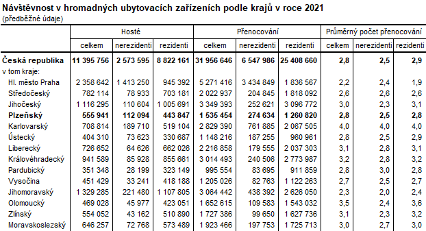 Návštěvníci strávili v průběhu roku 2021 v hromadných ubytovacích zařízeních Plzeňského kraje celkem 1 535 454 nocí a ve srovnání se stejným obdobím předchozího roku tento ukazatel zaznamenal nárůst o 2,4 %. Při přepočtu na jednoho hosta vychází průměrný počet přenocování na 2,8 noci a průměrná doba pobytu na 3,8 dne, při porovnání se stejným obdobím roku 2020 jde o srovnatelný průměrný počet přenocování. S průměrnou dobou pobytu 3,8 dní se řadí Plzeňský kraj ve srovnání s ostatními regiony na páté nejnižší místo v ČR a tato hodnota je srovnatelná s celorepublikovým průměrem (3,8 dní). Nejdelší průměrná doba pobytu byla zaznamenána v případě hostů Karlovarského kraje, a to 5,0 dní, naopak nejkratší v Hl. městě Praze (3,2 dny).