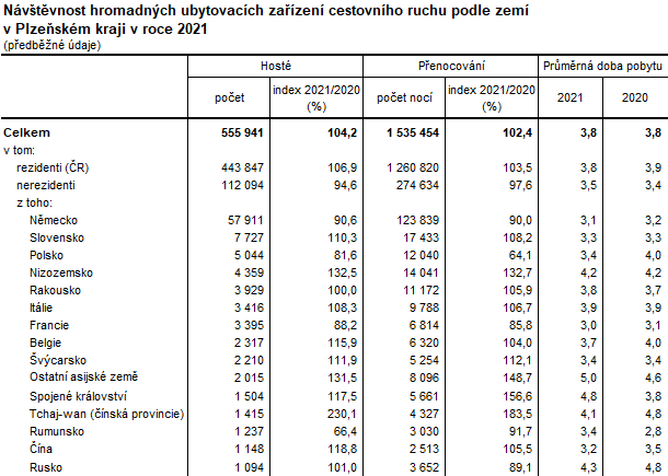 Z předběžných údajů vyplývá, že ve 4. čtvrtletí 2021 do hromadných ubytovacích zařízení Plzeňského kraje přijelo 114 894 osob, z toho 32,2 % byli hosté ze zahraničí (nerezidenti) a více než dvě třetiny tvořili tuzemští návštěvníci (rezidenti). Ve srovnání se stejným obdobím minulého roku návštěvnost kraje výrazně vzrostla, počet hostů byl téměř čtyř násobně vyšší než ve 4. čtvrtletí roku 2020. Nejpočetnější skupinu zahraničních turistů ve 4. čtvrtletí 2021 představovali návštěvníci z Německa. Plzeňský kraj jich navštívilo v tomto období 19 118, což byla více než polovina všech zahraničních hostů. Mezi další početnější skupiny zahraničních turistů patřili hosté ze Slovenska (2 212), Itálie (1 660) a Polska (1 642).
