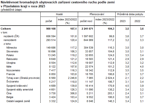 Z předběžných údajů vyplývá, že ve 4. čtvrtletí roku 2023 do hromadných ubytovacích zařízení Plzeňského kraje přijelo 168 968 osob, z toho 39,7 % byli hosté ze zahraničí (nerezidenti) a necelé dvě třetiny tvořili tuzemští návštěvníci (rezidenti). Ve srovnání se stejným obdobím předchozího roku návštěvnost kraje mírně vzrostla, celkový počet hostů byl o 4,2 % vyšší než ve 4. čtvrtletí roku 2022. Výrazněji se na tomto nárůstu podíleli zahraniční turisté, do našeho kraje jich přijelo o 7,7 % více v porovnání se 4. čtvrtletím roku 2022. Nejpočetnější skupinu zahraničních turistů ve 4. čtvrtletí 2023 představovali návštěvníci z Německa. Plzeňský kraj jich navštívilo v tomto období 33 261, což byla téměř polovina všech zahraničních hostů. Mezi další početnější skupiny zahraničních turistů patřili hosté ze Slovenska (4 252), Polska (2 697), Rakouska (2 339) a Tchaj-wanu (2 329).