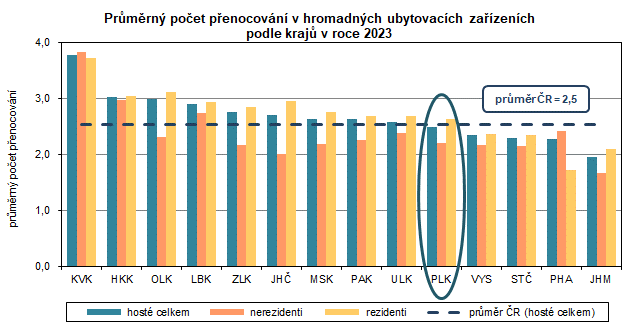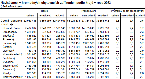 Návštěvníci strávili v průběhu roku 2023 v hromadných ubytovacích zařízeních Plzeňského kraje celkem 2 241 671 nocí a ve srovnání s předchozím rokem tento ukazatel zaznamenal nárůst o 4,3 %. Při přepočtu na jednoho hosta vychází průměrný počet přenocování na 2,5 nocí a průměrná doba pobytu na 3,5 dní. Při porovnání s rokem 2022 se doba přenocování snížila o 0,1 dne. S průměrnou dobou pobytu 3,5 dní se řadí Plzeňský kraj ve srovnání s ostatními regiony až na desáté místo v ČR a tato hodnota je srovnatelná s celorepublikovým průměrem (3,5 dní). Nejdelší průměrná doba pobytu byla zaznamenána u hostů Karlovarského kraje, a to 4,8 dní, naopak nejkratší v Jihomoravském kraji (3,0 dne).