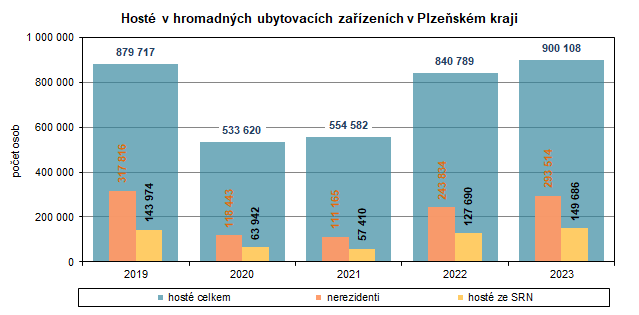 Hromadná ubytovací zařízení vykázala v roce 2023 vyšší návštěvnost ve srovnání s výsledky před pandemií v roce 2019. Z předběžných údajů vyplývá, že Plzeňský kraj navštívilo v roce 2023 celkem 900 108 hostů. V porovnání s rokem 2022 došlo k nárůstu počtu návštěvníků o 7,1 %. Plzeňský region navštívilo více než 293 tis. zahraničních turistů. Počet hostů ze zahraničí byl v tomto období vyšší o 49 680 hostů, což znamenalo nárůst o 20,4 %. V případě domácí klientely došlo k mírnějšímu nárůstu, a to o 9 639 hostů (1,6 %).