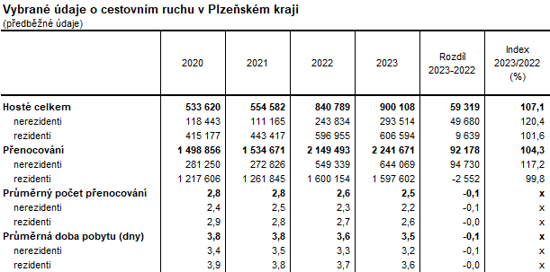 V Plzeňském kraji došlo v roce 2023 k meziročnímu nárůstu návštěvnosti i počtu přenocování. Průměrná délka pobytu při přepočtu na jednoho hosta se mírně zkrátila. Do regionu se vrátili zahraniční turisté. Hosté z Německa představovali stále nejvyšší počet návštěvníků ze zahraničí.