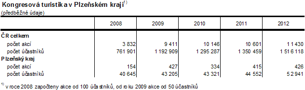Jedním ze zajímavých a rozvíjejících se součástí cestovního ruchu je kongresová turistika. Do ČR přijelo v roce 2012 podle předběžných výsledků 1 516,1 tis. účastníků konferencí / kongresů. V roce 2012 bylo v kraji realizováno 426 konferencí / kongresů s 52 941 účastníky (tj. 3,5 % z úhrnu v ČR). Význačným centrem kongresové turistiky je zejména město Plzeň.