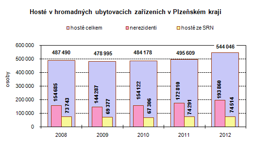 Podle předběžných výsledků navštívilo Plzeňský region v roce 2012 544 046 hostů, což představuje ve srovnání s rokem 2009 nárůst o 13,6 % (o 65,1 tis. hostů). Na zvýšeném počtu hostů se podíleli především zahraniční návštěvníci – nerezidenti (nárůst o 34,4 %), méně už tuzemští hosté – rezidenti (nárůst o 4,6 %). Počet hostů v Plzeňském kraji představoval téměř 4,0 % z celkového počtu návštěvníků ČR a zařadil se tak na šesté nejnižší místo v mezikrajském srovnání. Oproti roku 2011 byl zaznamenán pokles počtu hostů pouze v Jihomoravském kraji (index2012/2011 = 99,3 %). Počet návštěvníků nejvíce vzrostl v meziročním srovnání v kraji Plzeňském (o 9,8 %), Jihočeském (o 9,6 %) a Libereckém (o 7,6 %).