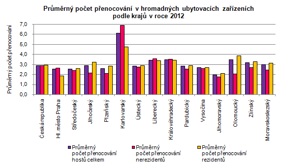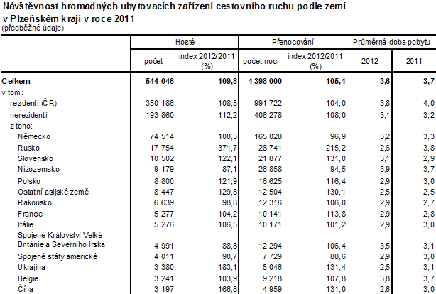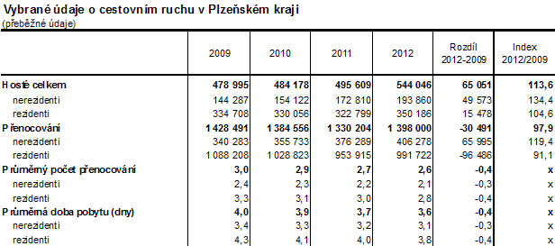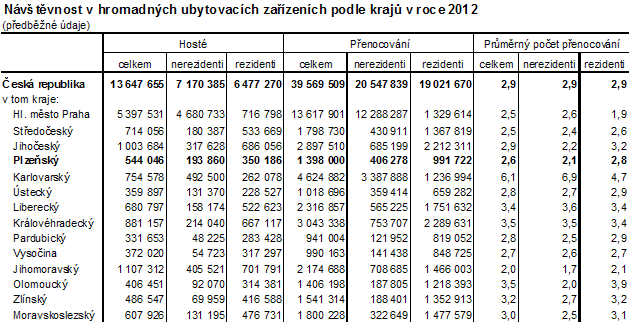 Počet přenocování hostů v hromadných ubytovacích zařízeních vzhledem k roku 2009 klesl o 2,1 %. Stejně tak se snížil v roce 2012 i průměrný počet přenocování na 2,6 dnů a z toho vyplývající průměrná doba pobytu na 3,6 dnů, což dokládá krátkodobý charakter cest. V rámci ČR došlo proti roku 2011 k poklesu počtu přenocování u šesti krajů, nejvyšší pokles zaznamenal kraj Olomoucký (o 5,1 %). Zbývajících osm krajů vykazuje přírůstek, z toho nejvyšší kraj Jihočeský (9,1 %). S průměrnou dobou pobytu 3,6 dnů se Plzeňský kraj řadí ve srovnání s ostatními regiony na čtvrté nejnižší místo v ČR a pohybuje se tak pod republikovým průměrem (3,9 dnů). Nejdelší dobu pobytu zaznamenal Karlovarský kraj, a to 7,1 dnů.