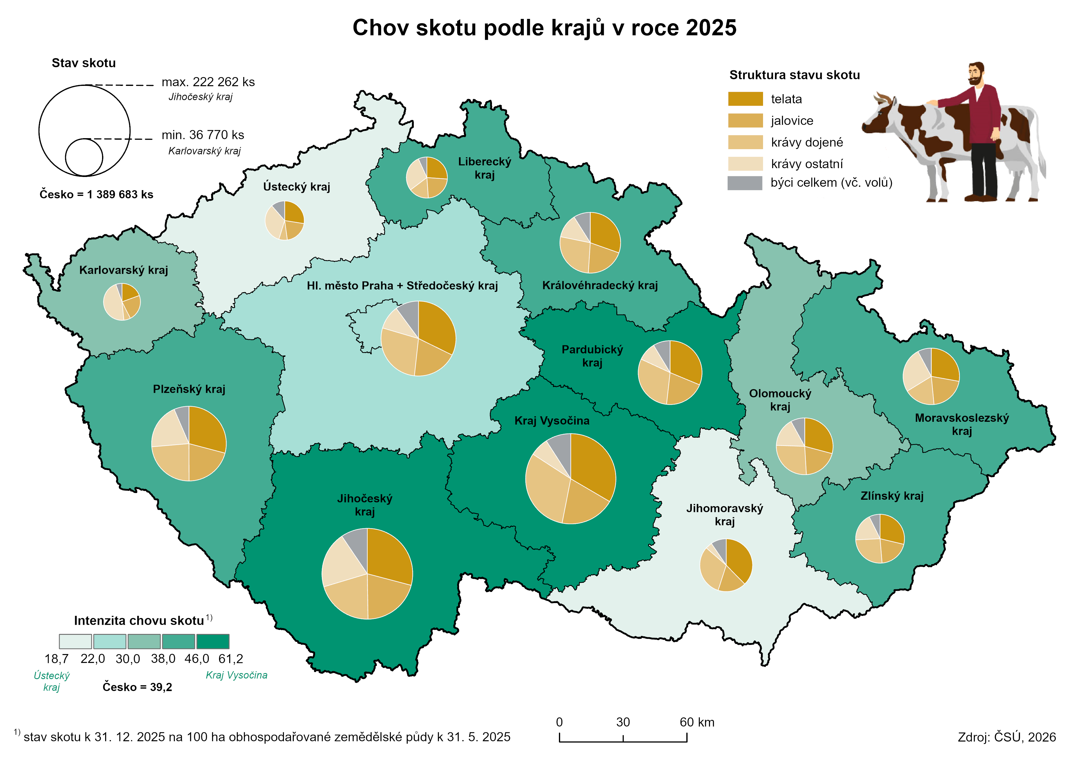 Podle předběžných dat dosáhl k 31. 12. 2025 počet chovaného skotu v Plzeňském kraji hodnoty 150 404 kusů, což představuje mírný meziroční pokles. Jedná se však o nejnižší úbytek v mezikrajském porovnání na rozdíl od kraje Karlovarského, kde byl kromě nejnižšího stavu skotu (36,8 tis. ks) mapován i jeho nejvýraznější pokles (o 5,3 %). Snížení stavu bylo evidováno napříč republikou ve všech krajích kromě Jihomoravského, kde se naopak o desetinu navýšil, ale také Zlínského a Moravskoslezského, v obou případech také došlo k mírnému růstu. Náš region se s celkovým stavem chovaného skotu zařadil na čtvrtou příčku za Jihočeský kraj, který dominoval s téměř 16% podílem na republikovém úhrnu, v těsném závěsu s Vysočinou, za kterou následoval Středočeský kraj vč. Prahy. Plzeňské chovy tak tvořily 10,8 % celkového stavu v rámci Česka (1,4 mil. kusů).