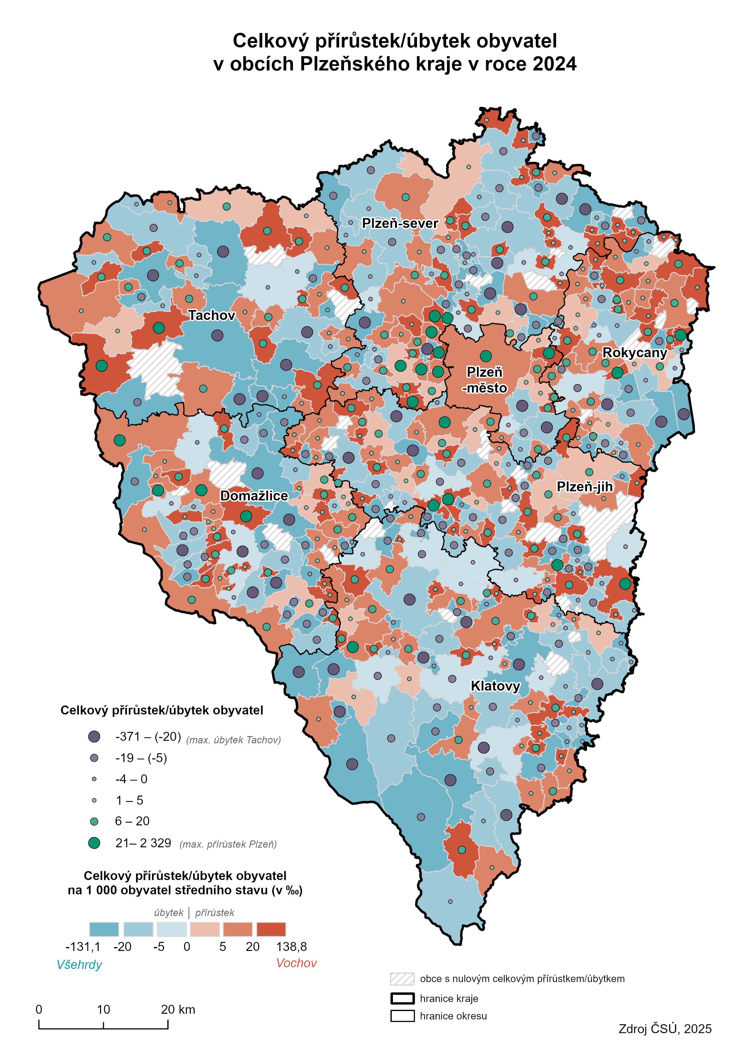 Co se týče celkového přírůstku obyvatel, i zde si nejvíce polepšila Plzeň. Během roku se počet obyvatel krajského města navýšil o 2 329, a to pouze zmiňovaným migračním přírůstkem, neboť přirozenou měnou bylo město ztrátové. Na rozdíl od Vochova, který je s absolutním přírůstkem 239 obyvatel na druhém místě, kde je kladné saldo stěhování doplněné i kladným přirozeným přírůstkem. V přepočtu na 1 000 obyvatel si obec Vochov v rámci kraje drží s hodnotou 138,8 ‰ prvenství. Největší celkový absolutní úbytek obyvatelstva byl zaznamenán na Tachovsku. Konkrétně v okresním městě Tachov se počet obyvatel během roku 2024 snížil v kraji nejvíce, a to o 371 osob, následován Borem (-243) a Planou (-199). Ve všech zmiňovaných městech měla na úbytku obyvatelstva zásadní vliv migrace. Relativně dosáhl celkový úbytek v přepočtu na 1 000 obyvatel nejvyšších hodnot v malé obci Všehrdy na severním Plzeňsku, která ve sledovaném roce přišla o 12,3 % obyvatel. V rámci 30 obcí kraje se v průběhu roku 2024 počet obyvatel nezměnil a jen ve 22 obcích kraje došlo k přírůstku obyvatel čistě kladným přirozeným saldem.